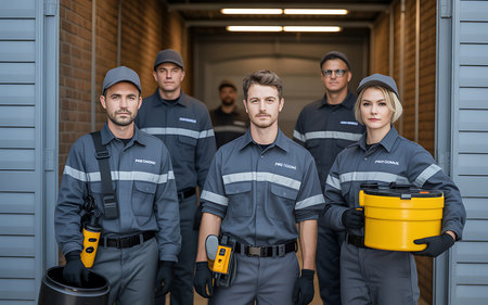 portrait of smiling workers in uniform standing in front of closed warehouse