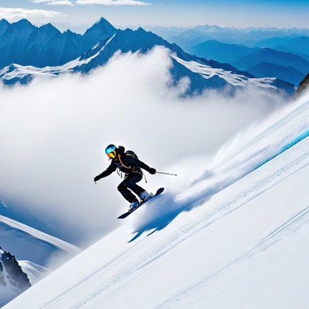 Mountaineer on the slope of a mountain in the clouds, Extreme skiing and jumping on the snow, no visible faces, AI Generated