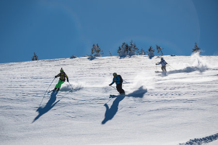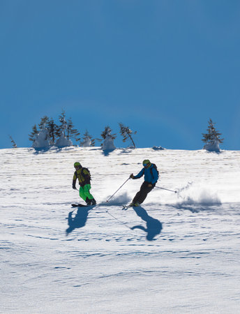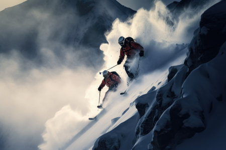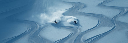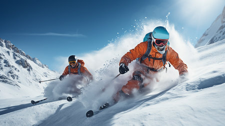 Freeride skiers carving down snowy mountain slope creating powder clouds. Freeride skiing