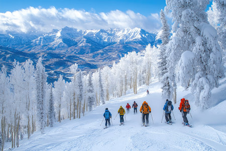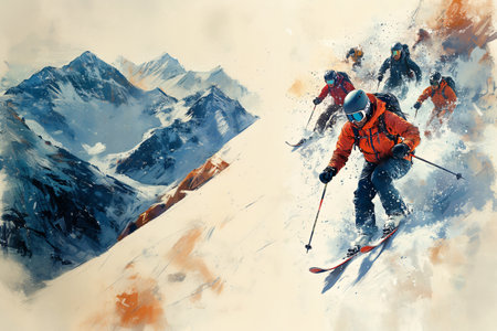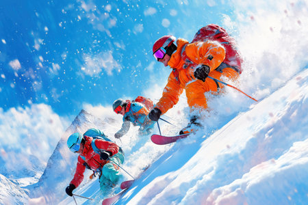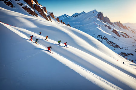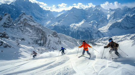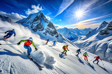 A group of skilled skiers descends a snowy slope against a backdrop of majestic mountains. The bright sun illuminates their vibrant gear, capturing the thrill of winter sports.