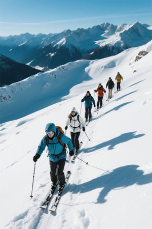 Group of Skiers Navigating a Snowy Mountain Slope During a Bright Day in Winter, Showcasing Teamwork and Thrill in Challenging Terrain. Generative AI