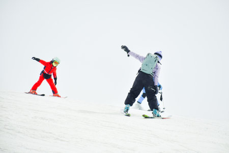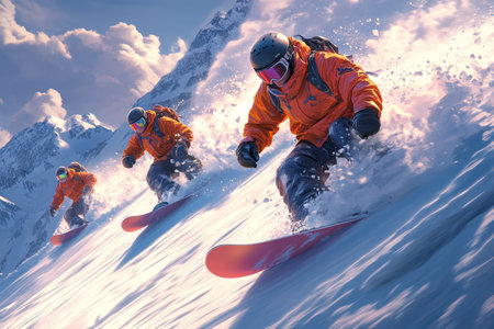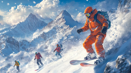 Exhilarating Winter Sports Adventure Snowboarders and Skiers Carve Through Mountain Landscape