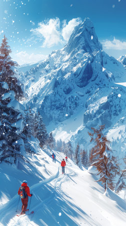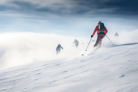 Group of adventurous skiers conquering a steep slope amidst majestic mountains and clouds