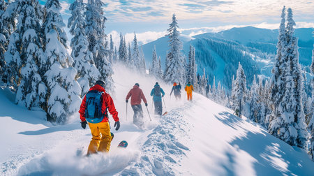 Skiers dressed in colorful gear carve through the deep powder, leaving trails on the pristine white snow on a bright winter day.