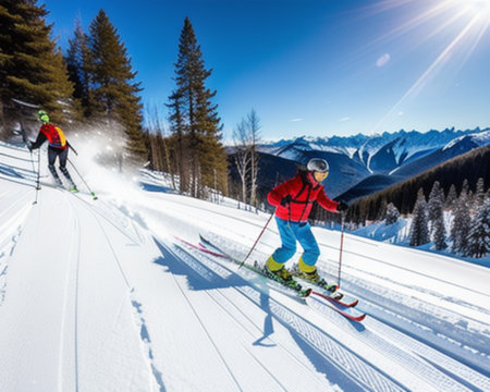 Exciting Skiing Adventure on Fresh Powdery Slopes in a Stunning Mountain Landscape on a Sunny Day During Winter. Generative AI