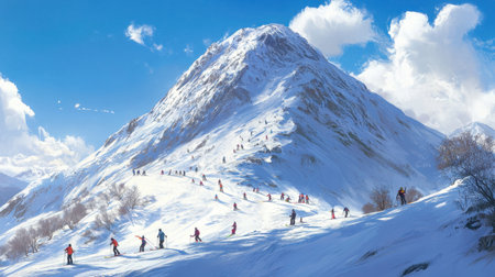 A vibrant winter scene showing skiers navigating a snow-covered mountain. The bright blue sky and fluffy clouds create a stunning backdrop for outdoor adventure.
