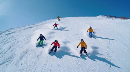 Skiers in Colorful Gear Glide Down Snowy Slope, Capturing the Thrill of Winter Sports, 4K