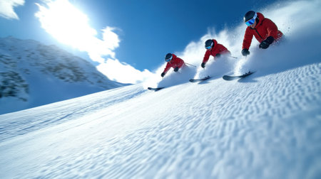 Three skiers carve down a sunny, powder-covered mountain slope, kicking up fresh snow under a clear blue sky, creating a dynamic winter sports action scene