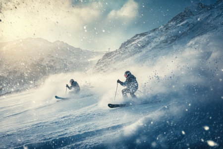 Skiers downhill snowy mountain, blizzard background, winter sport action