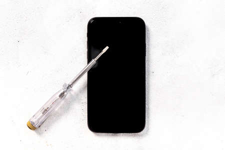 Screwdriver and broken smartphone on the wooden table. repair service