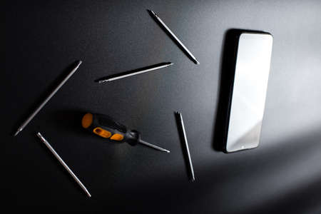 Black smartphone with small electronic repair screwdrivers on black background with copy space.