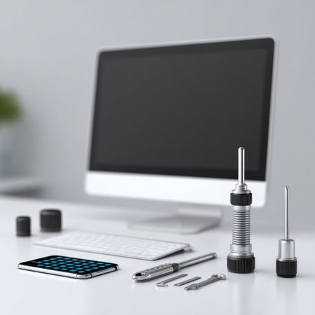 This image showcases a modern workspace featuring a computer and smartphone alongside essential tools for tech repair. Ideal for representing innovation and efficiency.