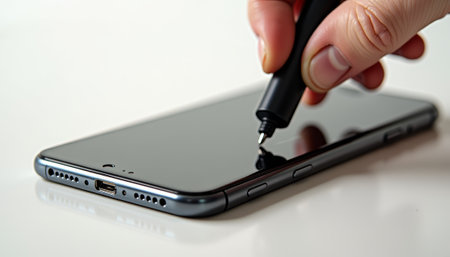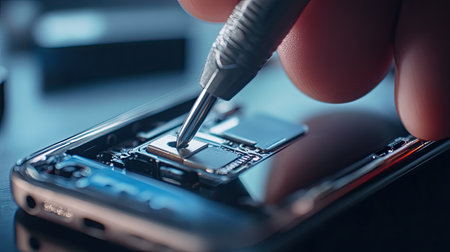 A closeup of a technician's hand using a tool to repair a smartphone circuit board, showcasing precision and attention to detail in electronics maintenance and assembly.
