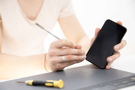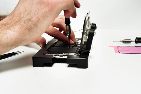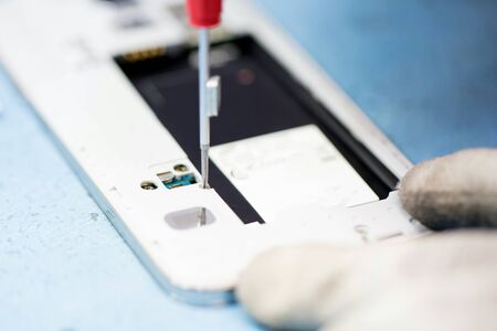 A man is repairing a Smartphone. Hands hold a screwdriver and disconnect the sim card loop. Services Repair. Selective focus.