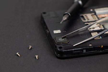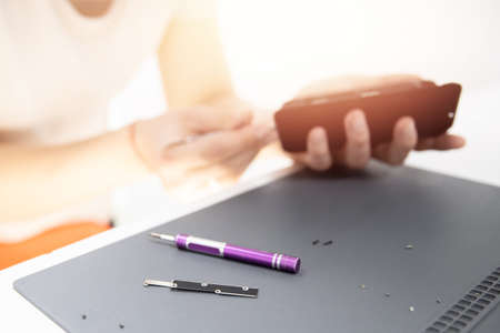 Repair faulty mobile phone on desk. concept of computer hardware, mobile phone, electronic, repairing, upgrade and technology.