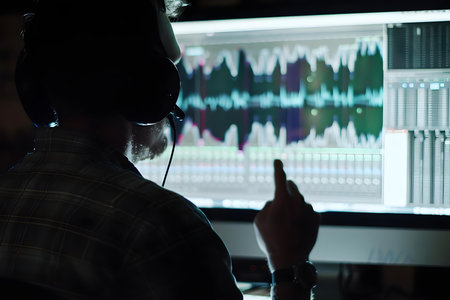Professional audio mixer with colorful waveforms displayed on screen in recording studio