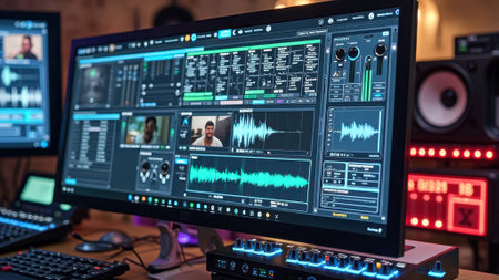 Audio editing workspace with advanced sound mixing software and dual monitors. That the image is generated using AI.