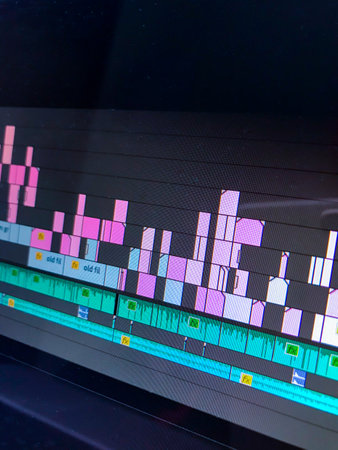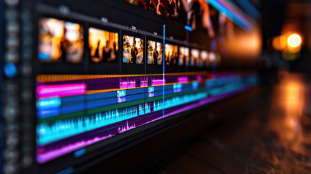 Editing software interface displays colorful timeline with audio and video tracks, showcasing creative process. vibrant colors and organized layout evoke sense of productivity and artistic
