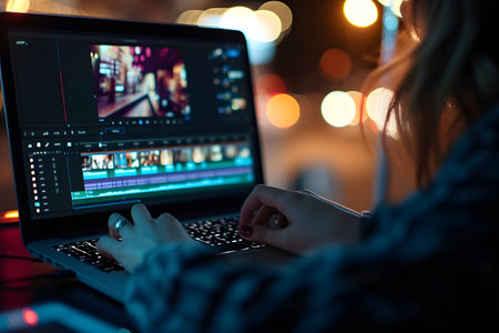A laptop screen showcases video editing software, situated on a desk cluttered with various objects. The scene exhibits a shallow depth of field, with soft lighting and a bokeh effect. This image could be suitable for illustrating technology, media production, or creative workflows in various commercial contexts.