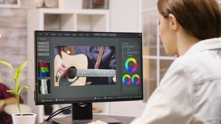 Desk work editor laptop working with video footage cutting filmmaking of content creator