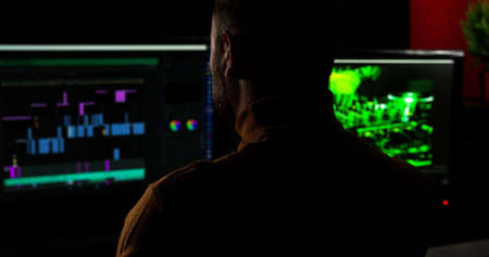 Back view of a young white man video editor sitting in front of a big screen working on a video montage indoors