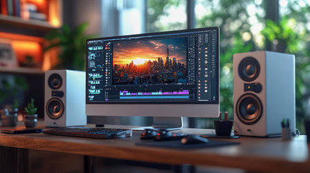 A modern workstation with a computer, speakers, and a professional video editing interface on the screen, designed for video editing and post-production.