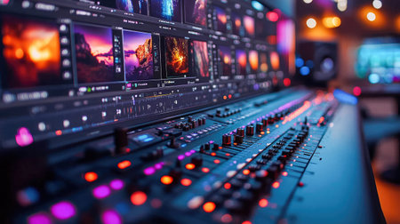 A video editing studio equipped with multiple monitors and a keyboard for editing footage, High-tech cameras and editing software for precision perfection