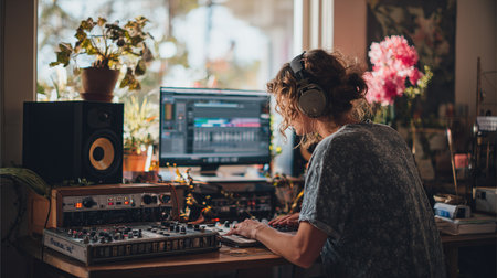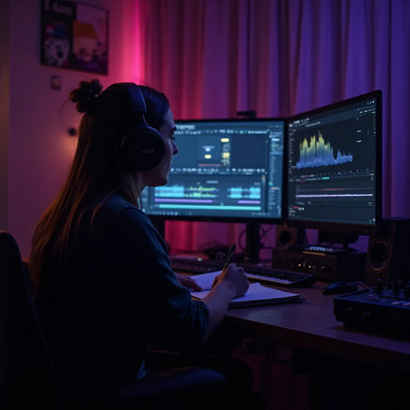 A young woman intently works on a mixing console in a dimly lit recording studio, surrounded by audio equipment and monitors.