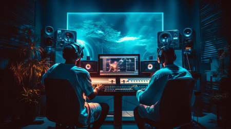 Inside a professional recording studio the control room buzzes with musical creativity. Concept Music Production, Recording Studio, Control Room, Creativity, Professional Setting