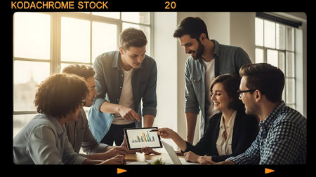 A group of people collaborating in a modern office space, with a laptop displaying design work in the foreground, plants and shelves in the background