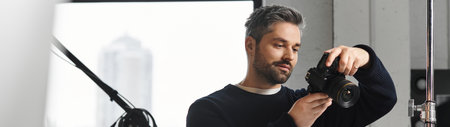 A dedicated man adjusts his camera, seeking the perfect shot in a studio.