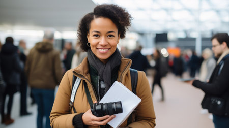 Early 30s reporter digital camera notepad natural light
