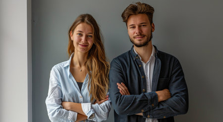 Two individuals pose confidently in a contemporary office setting.