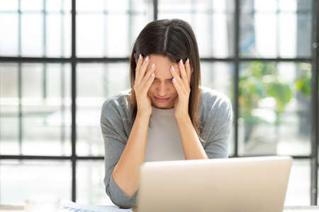 Young business women feeling headache and touching her temples. She is working at the office desk in front of laptop and facing on problem under sunlight. Business and finance concept.