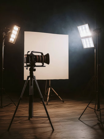 A camera positioned on a tripod is surrounded by bright studio lights and a blank backdrop, creating an ideal setting for a photoshoot.