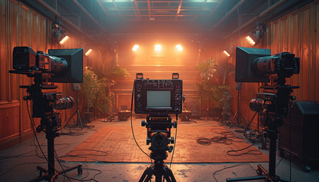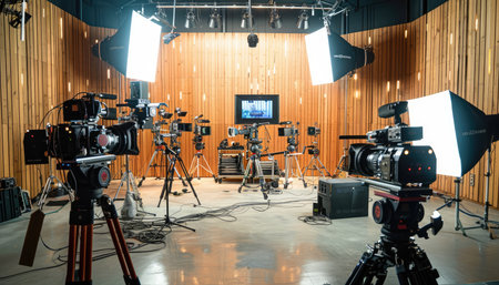 A professional film studio set up featuring multiple cameras, lighting equipment, and tripods, showcasing the tools of filmmaking.