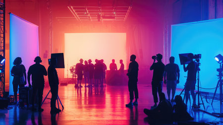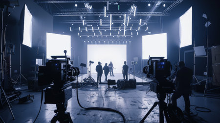Behind-the-scenes silhouette of a video production team, with a director, cameraman, and lightman coordinating in a studio for a commercial shoot