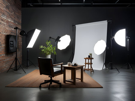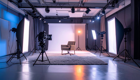 Modern photography studio featuring professional lighting setup and empty chairs, perfect for capturing stunning visuals in a creative environment.