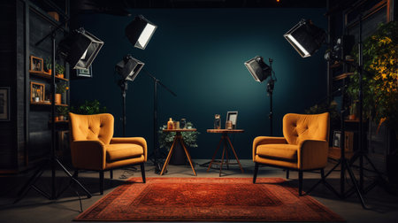 Empty studio without people. Studio for interviews or podcasts. Generative AI