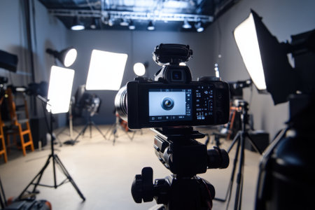 Camera on a tripod in a studio with lights.