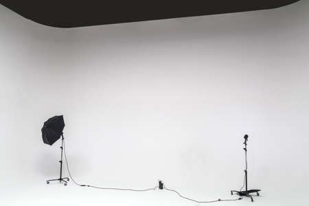 Interior of modern photo studio with white walls, white floor and lighting equipment