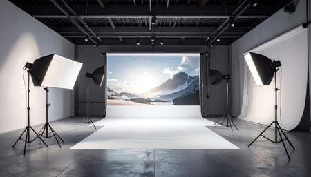 Wide shot of a professional photo studio setup, featuring a large screen displaying a stunning, seamless backdrop of mountains and snow at sunrise, surrounded by softbox lighting. Ideal for virtual production, commercial, and creative concepts.