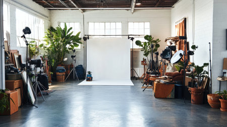 Interior of modern photo studio with empty white poster and equipment. Mock up, 3D Rendering, An empty modern photo studio ready for use, AI Generated