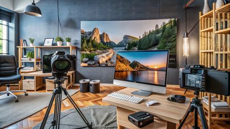 Modern home office with two cameras set up for video recording, a computer and a large landscape photograph on the wall.