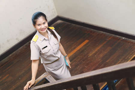 A Young beautiful Asian worker with brown uniform bringing document. Indonesian PNS.