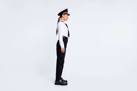 Profile photo of charming successful lady look empty space wear aviator hat uniform isolated white color background