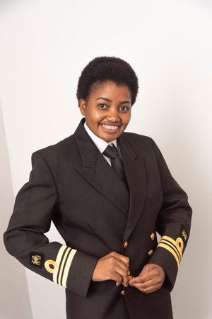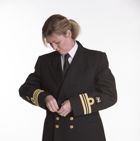 Closeup of a woman wearing a uniform jacket . Airline pilot buttoning jacket.