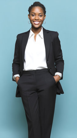 Features a cheerful African American woman dressed in a stylish black suit and white shirt, posing with both hands casually placed in her pockets against aqua backdrop.