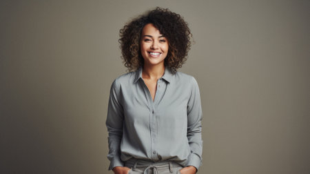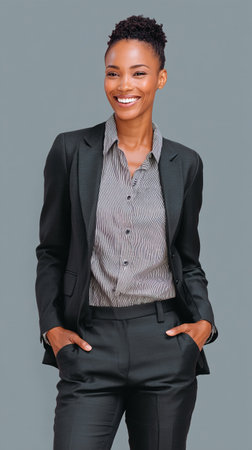 Full shot features happy African American woman in a dark business suit with hands in her pockets. The background is a simple grey, allowing the focus to remain on her.