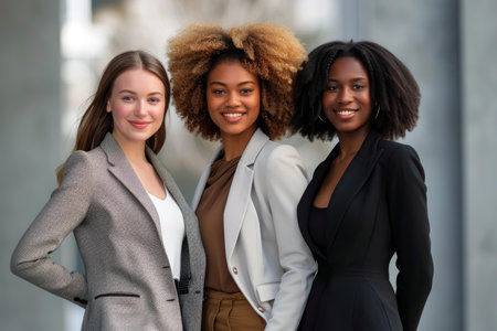 Three confident businesswomen of different ethnicities posing in smart attire